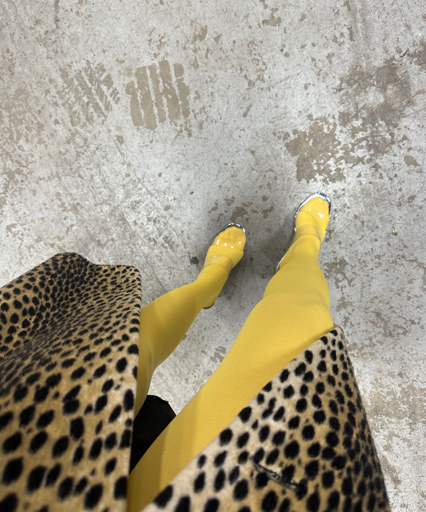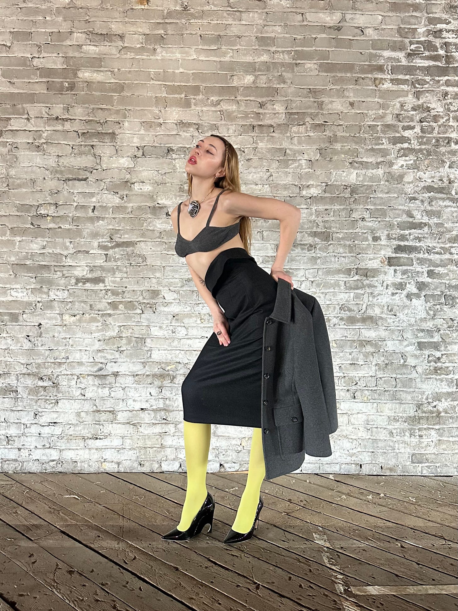 I’m making colored tights my entire personality this season. I love this look, featuring a wool asymmetrical midi skirt from Jil Sander (still available, might I add). Paired with my favorite Dior patent heels, a cashmere bralette, and a stunning wool Celine jacket that sold almost immediately (with good reason).